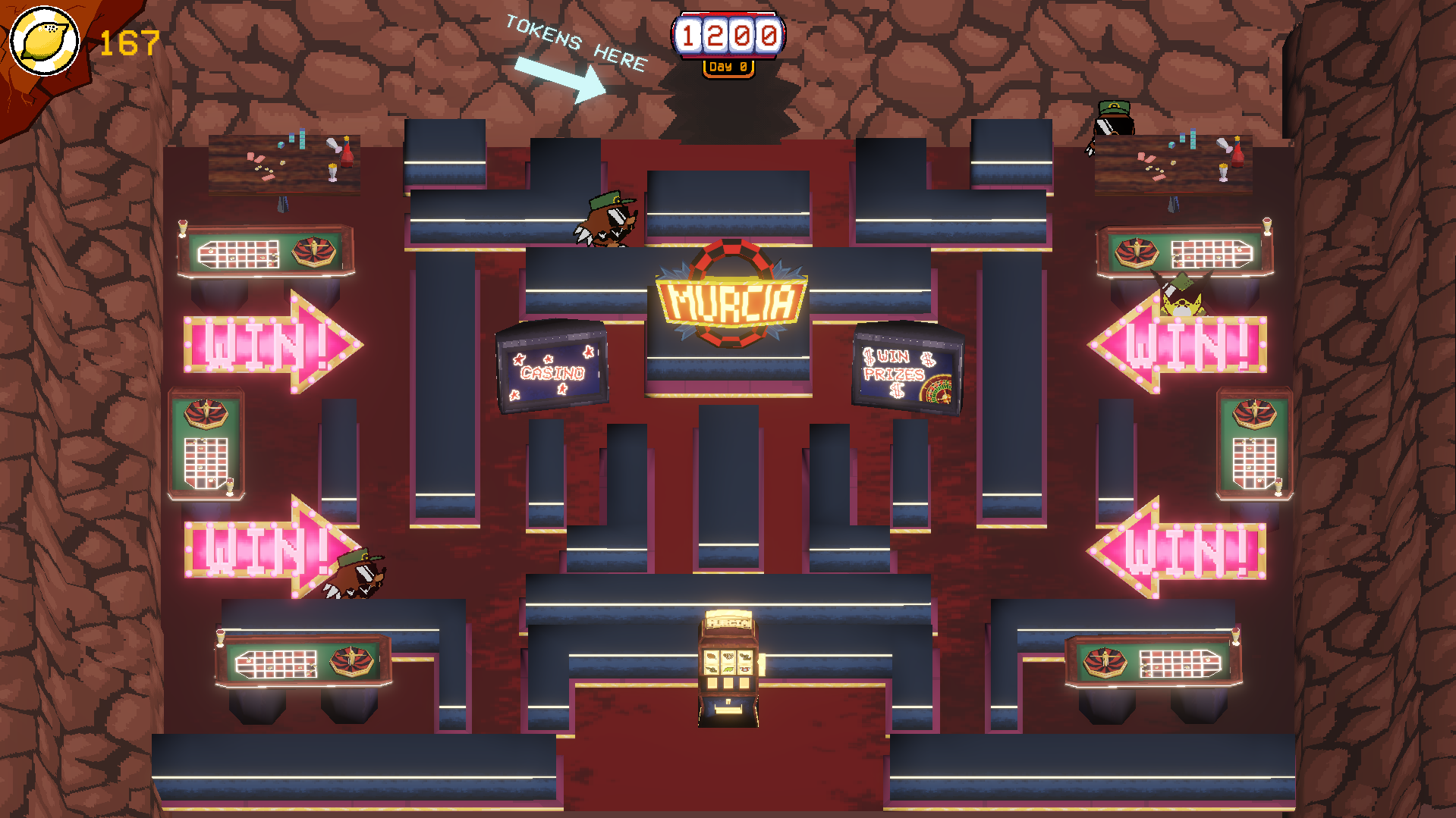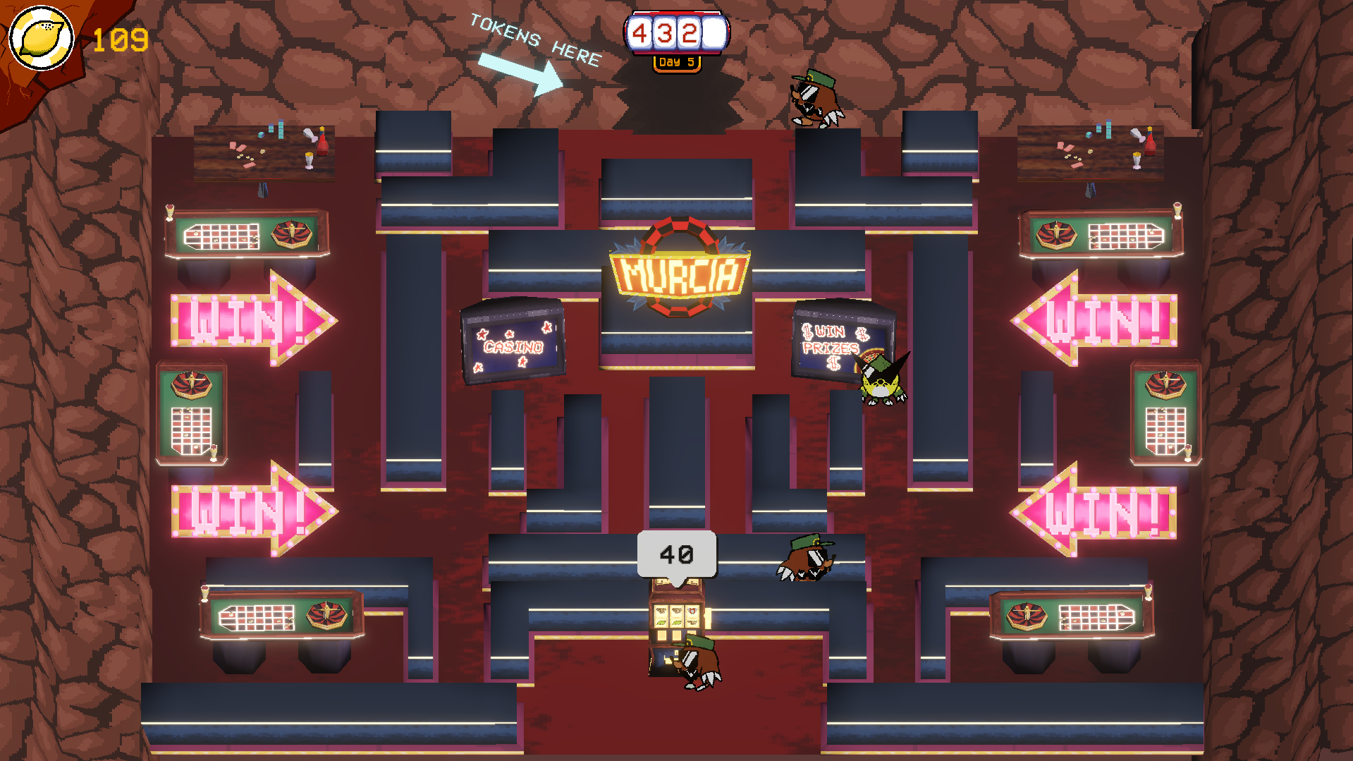 Simplemente interactúa con la tragaperras pulsando E para ganar dinero y llévalo al túnel al fondo del casino para saldar la deuda. El movimiento funciona con WASD. Los elementos de la interfaz indican la cantidad de deuda pendiente y el número de rondas que han pasado desde que comenzó el juego.